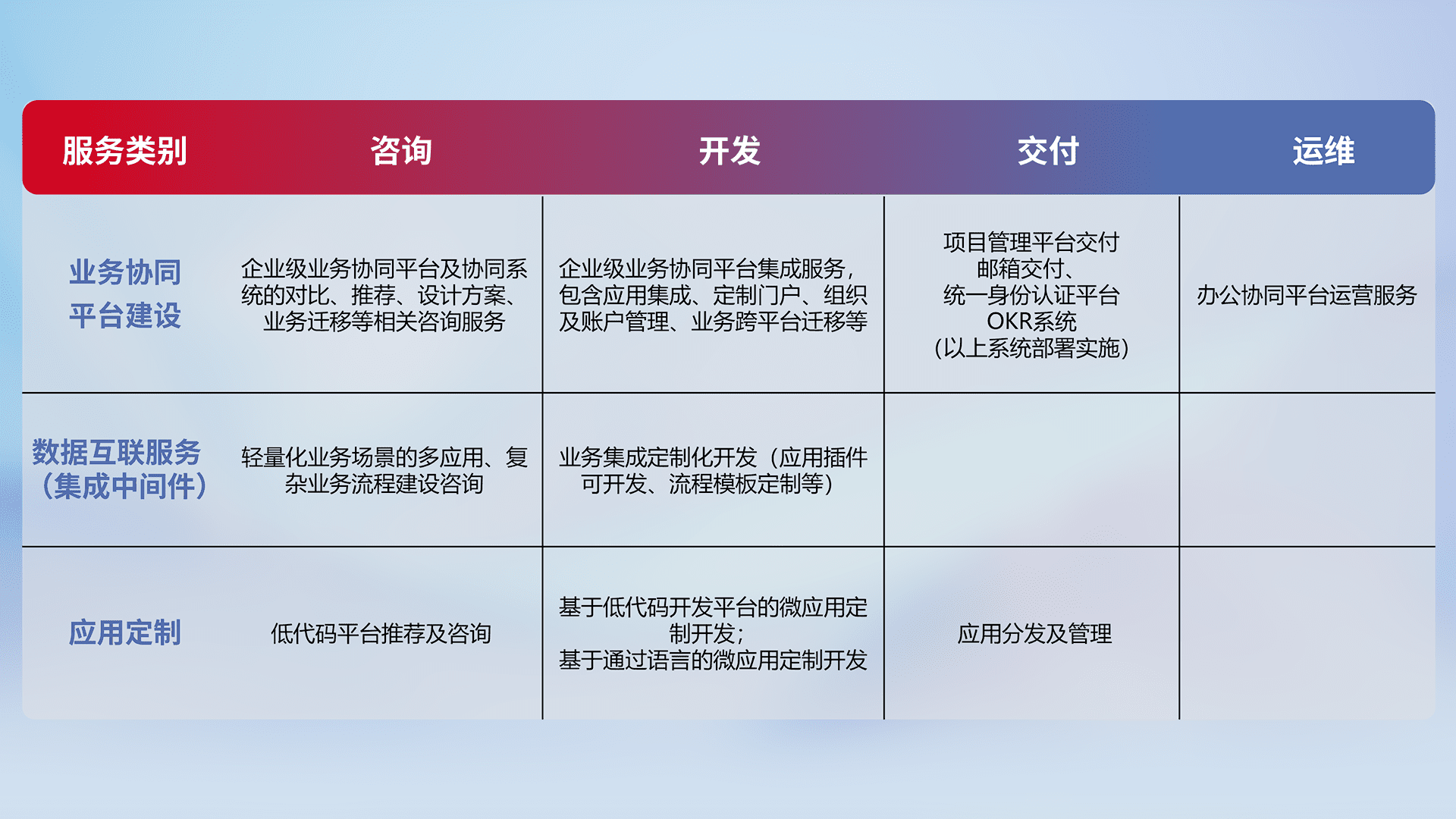 针对钉钉、、企微、、、IDaas等平台级产品提供产品的规划、、方案、、交付、、、定制化开发等服务,,,实现如统一协同办公、、、智能客户服务、、混合会议管理、、、智能数据查询、、、、等业务场景,,,,实现数字化转型。。