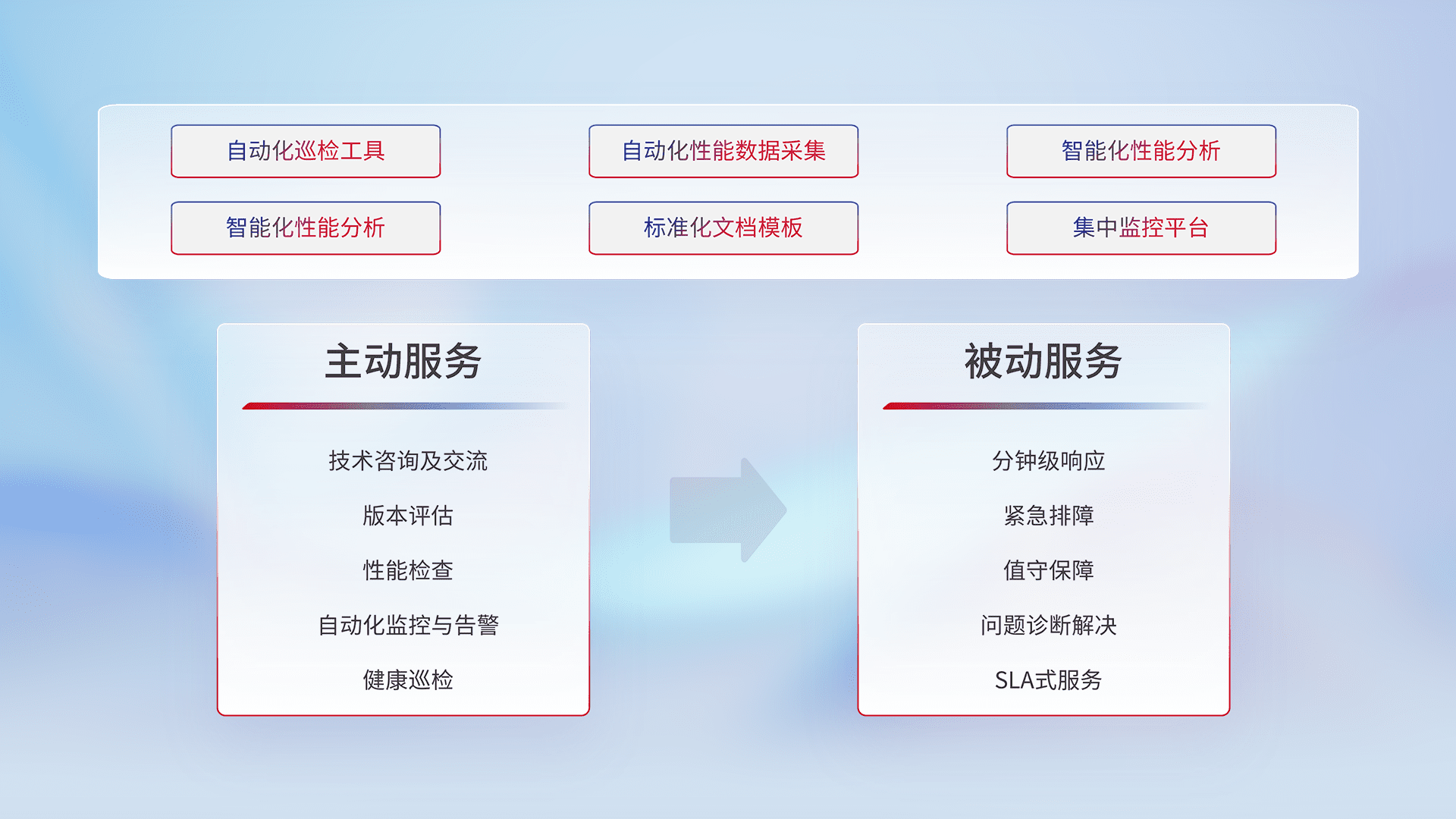 智能化工具和标准化文档,,,保障服务质量,,,提供主动服务(包含技术咨询、、、版本评估、、性能检查、、、、自动化监控与告警、、、、健康巡检)和被动服务包含(分钟级响应、、、紧急排障、、、、值守保障、、问题诊断解决、、、、SLA服务)。。。
